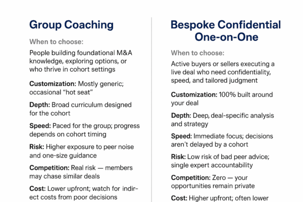 Buying or selling a small or midsize business is high‑stakes, idiosyncratic, and full of hidden costs. The advisory structure you choose affects confidentiality, speed, and the financial outcome. Bespoke one‑on‑one aligns an expert’s judgment directly with your deal.